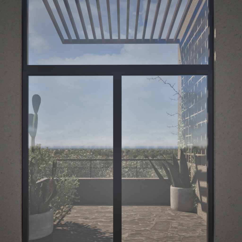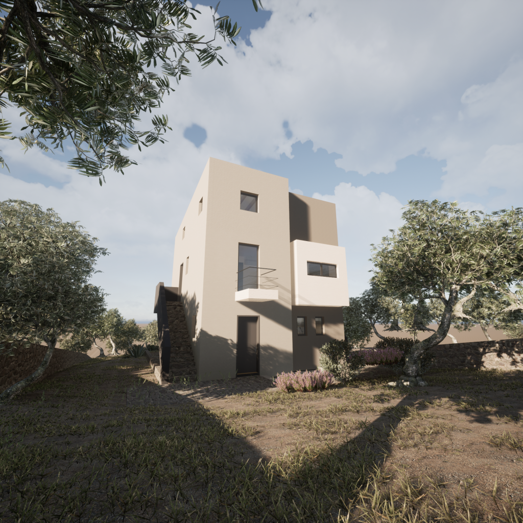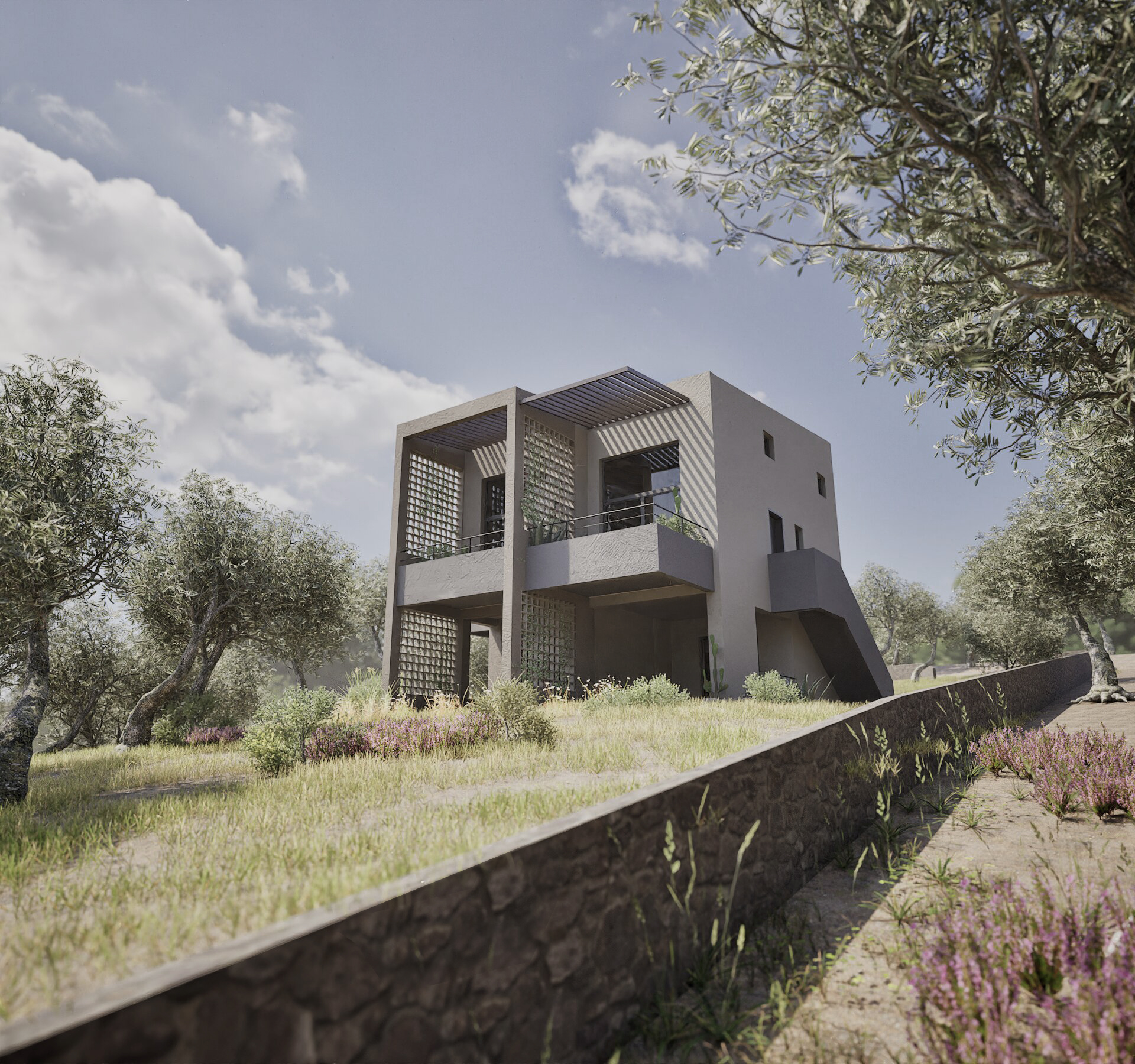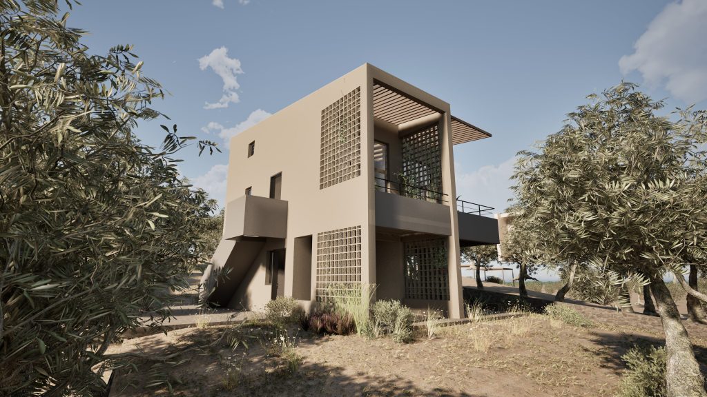 Divided into two linear entities perpendicular to the plot’s slope, the residences’ roofs mimic the land’s inclination, blending seamlessly with the terrain. Each entity accommodates two residences, oriented towards the sea and featuring a mezzanine under the roof. To maintain privacy and prevent co-visibility, the volumes “slide” along the sunpath, while klostrá elements serve as sun filters and privacy screens. Textured plaster in earthy tones accentuates the volumes, integrating them harmoniously with the landscape. Surrounding olive trees and native vegetation create a Mediterranean garden, offering residents a tranquil space to reconnect with nature and unwind.