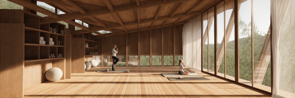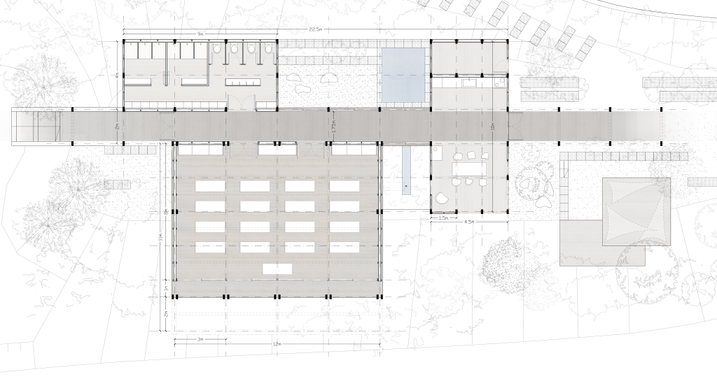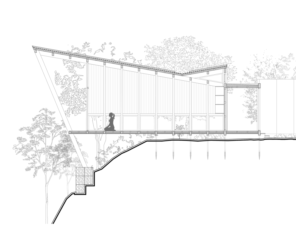 The design approach aims to create an unobstructed yoga practice space (shala) at the core of the plot, without blocking its permeability. It is situated at the end of the cliff, floating above it, framing the breathtaking view of Vale de Moses. All the auxiliary spaces are placed behind it, in a distance, creating an L shaped volume. An open-air corridor connects and separates at the same time- the main and secondary functions. It creates a promenade in the forest, stimulating senses with different frames of view and different materialities.